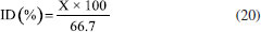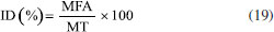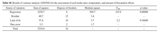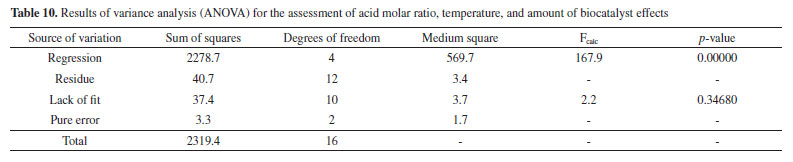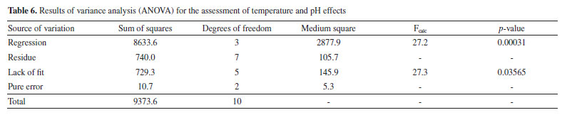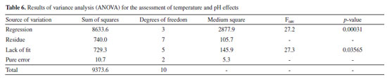 An analysis of variance (ANOVA) was performed and its calculated values are shown in Table 6. Although the model showed lack of fit, as Fcalc > Ftable and R2 = 92.11%, the model can be considered statistically significant, given the fact that experimental values fit predicted ones.