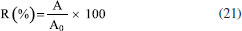 Hydrodynamic characterizations of the fixed bed reactor The mixture was characterized through the determination of axial dispersion described by Zanin and Moraes.27 Space-time, τ (min), was calculated according to Levenspiel.28 Residence time distribution was experimentally determined by pulse-type injection of a Rosa MixT dye solution (São Paulo, Brazil, purchased from a local market) into a jacketed acrylic reactor with 20.5 cm in a height and 2.2 cm in diameter to be subsequently used in the reactions. Tracer concentration was measured spectrophotometrically (545 nm) at the reactor outlet (GENESYS 10S UV-Vis; Thermo Fisher Scientific, San Jose, CA, USA) as a function of time. Residence time distribution (DTR) function, E(t), was calculated according to Equation 16 considering constant volumetric flow: ![]() where: C(t) is the concentration at each time; ∫ 0 ∞ C ( t ) d t : area under the tracer concentration curve as a function of time data by the integral. Mean residence time, tm (min), was calculated according to Equation 17. ![]() Equations 8 and 9 were calculated using the OriginPro 2022® software (Origin Lab Corporation, Washington, USA).25 The recalculated space-time, τ∗ (min), is demonstrated by Equation 18.29 ![]() where: Vtotal is the total reactor volume (mL); Vc: volume of connections (mL); v: flow (mL min-1). Synthesis of triglycerides in fixed bed reactor (FBR) Regarding the synthesis of TAGs in a fixed bed reactor, a jacketed acrylic reactor with 20.5 cm in height and 2.2 cm in diameter was used and operated at a temperature of 41 °C, and the reaction was kept at a feed rate of 1 mL min-1 in flow rising for 96 h. The reaction medium consisted of grape seed oil and capric acid (C10) in a molar ratio of 1:3 and the reactor bed was filled with 15 g of the immobilized biocatalyst. Aliquots were collected at 0, 1, 2, 4, 8, 24, 46, 72 and 96 h. Triglyceride separation, methylation and determination of the fatty acid composition Once the reactions were carried out, the reaction medium was neutralized using a KOH hydroalcoholic solution at 0.8 mol L-1 (30% ethanol) and TAGs were then separated as described by Wang et al.,30 TAGs were methylated according to ISO 12966-231 with a few adaptations. The composition profile of produced fatty acid was determined by gas chromatography according to ISO 12966,32 i.e., by replacing helium gas with nitrogen gas. The incorporation degree, ID (%), which determines the amount of acid incorporated into the triglyceride molecule, was calculated according to Equation 19 with a few modifications:33 ![]() where: MFA is the number of moles of medium chain fatty acids (C10:0), MT: number of total moles of fatty acids in triglyceride. The obtained ID values (%) were normalized according to Equation 20. As the lipase used is 1.3 specific, the replacement of fatty acids only occurs in the sn-1 and sn-3 positions of triglyceride, resulting in a maximum incorporation degree of 66.7%. ![]() where: X is the non-normalized ID value obtained. Enzyme reuse The possibility of reusing the immobilized enzyme was evaluated by relative activity after use in the reaction. The immobilized lipase was separated from the reaction by filtration, washed thoroughly with hexane and dried with nitrogen. The relative activity (R) was calculated through the relationship between the hydrolytic activities20 before and after the reaction, using Equation 21: ![]() where: A is the post-reaction hydrolytic activity (U g-1), A0: initial hydrolytic activity (U g-1).
