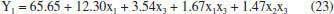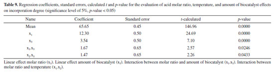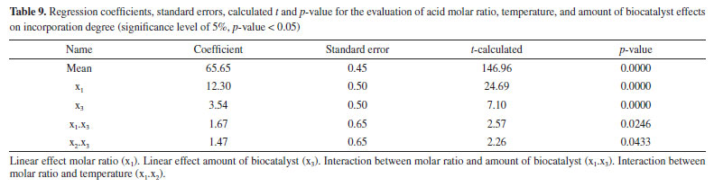 It was observed that the ID of C10 in grape seed oil ranged from 42.62 (exp 9) to 86.93% (exp 10). The degree of incorporation ID (%), determines the amount of acid incorporated into the triglyceride molecule, and is an important parameter for the efficiency of acidolysis. The difference between higher and lower values was due to acid molar ratio, indicating the influence of this parameter on ID values, which may be associated with the fact that there was more fatty acid in the reaction medium. In addition, the results from the experimental design matrix demonstrate that molar ratio is highly significant, as well as the amount of biocatalyst, which is corroborated by the results shown in Table 9 revealing the striking effects of variables at 5% significance (p-value < 0.05). Molar ratio (x1) and biocatalyst amount (x3) linear were significant effects, in addition to their interaction (x1.x3) and that between molar ratio and temperature (x1.x2). Positive values indicate that an increase in these variables leads to higher ID values.
