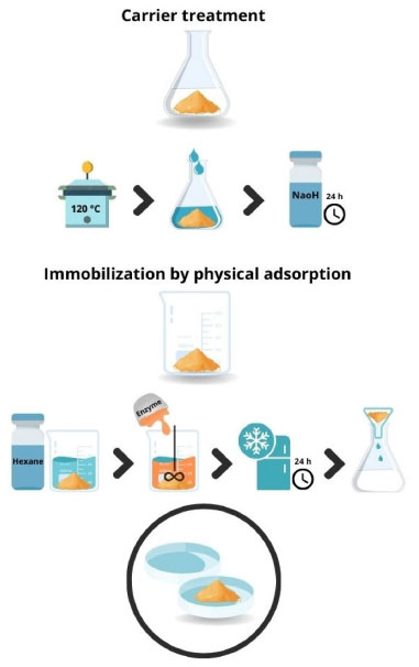![]() Figure 1. Scheme of the preparation of enzymes process; carrier treatment and immobilization by physical adsorption