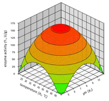 ![]() Figure 2. Response surface plot of immobilized enzyme hydrolytic activity as a function of temperature and pH
