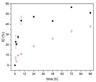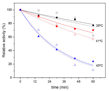 ![]() Figure 3. Thermal deactivation profile of free and immobilized enzymes at 35, 41 and 45 °C. Nonlinear adjustments of free (dash-dotted) and immobilized (solid dot) enzyme
