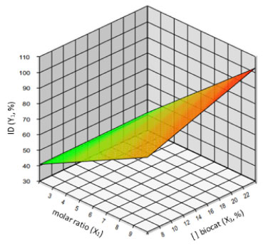 ![]() Figure 4. Response surface plot of degree of incorporation (ID) of capric acid as a function of grape seed oil/capric acid molar ratio and amount of immobilized biocatalyst in a stirred tank reactor