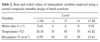 ![]() where: AR is the relative enzyme activity (%) at incubation time t (min); AR0: initial relative enzyme activity (%). Deactivation energy Ed (J mol-1) was obtained by a linear regression of kd as a function of temperature T (K) calculated according to Equation 11:23 ![]() where: R is the universal gas constant (8.314 J K-1 mol-1); A: Arrhenius' constant. The stability factor SF (adimensionaless) determines immobilization efficiency, which is calculated by Equation 12:23 ![]() where: t1/2immobilized is the immobilized enzyme half-life time (min); t1/2free: that of the free enzyme (min). The enthalpy ∆H (J mol-1), Gibbs free energy ∆G (J mol-1) and entropy ∆S (K = kJ mol-1) required for enzyme thermal denaturation was calculated according to Equations 13, 14 and 15, respectively:24 ![]() where: h is the Planck's constant (11.04 × 10-36 J min-1); kB: Boltzmann's constant (1.38 × 10-23 J k-1). Nonlinear regressions were performed using the OriginPro 2022® software (Origin Lab Corporation, Washington, USA).25 Grape seed oil characterization Grape seed oil was characterized based on its peroxide index (PI) defined according to the American Oil Chemist's Society Cd 8b-90 method.26 Synthesis of triglycerides in batch stirred-tank reactions (BSTR) For synthesizing the triglycerides, a reaction medium containing grape seed oil and capric acid (C10) was prepared in different proportions to obtain a final volume of 20 g. Then, an amount of biocatalyst was added to the mixture and placed in a stirred tank reactor with 6 cm in height and 3 cm in diameter operating in batch mode whose temperature was controlled by a thermostatic bath. Reactions were maintained for 24 h under magnetic stirring at 200 rpm. Ultimately, the medium and enzyme were separated, and then the medium was stored under refrigeration at approximately 7 °C. To define optimal molar ratio parameters for capric acid, reaction temperature and amount of biocatalyst to be used in the synthesis of triglycerides, a 23 central composite rotational design (CCRD) was carried out using the software Protimiza Experimental Design®.22Table 2 shows the values selected for each variable under analysis.