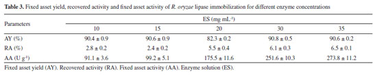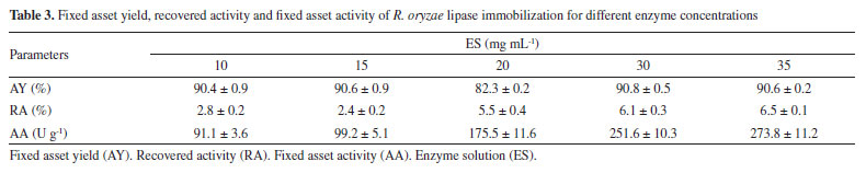 RESULTS AND DISCUSSION Immobilization by physical adsorption As regards the immobilization of R. oryzae lipase, the best enzymatic loading was explored with the aim of reaching optimal biocatalyst performance without overusing it. Table 3 presents the results of fixed asset yield (AY), recovered activity (RA) and fixed asset activity (AA) for each enzyme solution (ES).