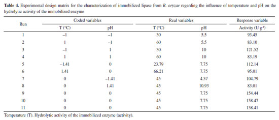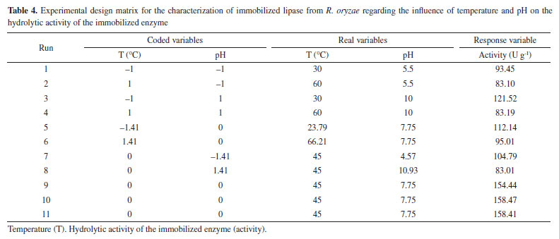 In terms of AY, there was no marked difference between enzyme loadings, as values higher than 90% were found, except for ES 20 mg mL-1. Otherwise, increased enzyme loading has led to RA improvement, reaching higher values of 6.1 and 6.5% at ES 30 and 35 mg mL-1, respectively. The same behavior was observed for AA at 251.6 and 273.8 U g-1 using ES 30 and 35 mg mL-1, respectively. Based on these results, an enzyme loading of 30 mg mL-1 was the best result, as good immobilization yield (90.8%) and considerable recovered activity (6.1%) were achieved, with a load of approximately 33.23 mg of protein per g of carrier. RA demonstrates the amount of active enzyme on the carrier. Negative factors such as binding of the enzyme's active center to the carrier, loss of catalytic structure, enzyme desorption or low substrate accessibility to the enzyme may contribute to low RA. Nonetheless, there was an increase in enzyme activity, possibly due to the selected method of carrier immobilization,34 which is a factor of greater interest and decisive to monitor the presence of active lipase, moreover, it remained unchanged and close to that presented by the solution having the highest concentration. In fact, the properties of agricultural residues such as high porosity and high surface area favor potential applications in immobilization. Furthermore, the presence of different chemical groups (amino, hydroxyl, carboxyl, thiol and phosphate groups) can be involved in several complex mechanisms, such as surface adsorption. In this way, enzyme industries can benefit from the advantages of using agro-industrial waste, aligned with the requirements of green technologies and also significant economic benefits.7 Zhang et al.35 reported immobilization yield of 93.0 ± 0.2% and enzyme load of 28.1 ± 0.3 mg g-1 using lignin derived from corn cob residue as carrier to immobilize lipase B from C. antarctica. Machado et al.36 achieved maximum immobilization yields of 55% through lipase from Thermomyces lanuginosus (TLL) immobilized via interfacial activation on silica particles from rice husks functionalized with triethoxy(octyl)silane. Therefore, it is worth emphasizing the true potential of using corn cob as a carrier, as well as the selected immobilization method. Furthermore, results show that greater loading is not necessary, in addition to the fact that it might have reached or is close to carrier saturation. Immobilized enzyme characterization Optimal pH and temperature The immobilized enzyme was characterized as for optimal pH and temperature conditions using an experimental design, and hydrolytic activity was selected as response variable. Table 4 presents the experimental design matrix to evaluate the influence of temperature and pH on the immobilized enzyme hydrolytic activity.