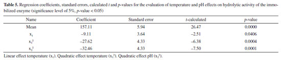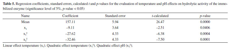 Runs 9, 10 and 11 (central points) presented higher activity values, 154.44, 158.47, 158.41 U g-1, respectively, evidencing that 45 °C and pH 7.75 were optimal conditions for enhancing the immobilized enzyme performance. The Protimiza Experimental Design® software22 allowed carrying out a statistical analysis of results so as to find regression coefficients, standard errors, and calculated t and p-values for significant variables (Table 5). p-Values indicate that temperature (linear and quadratic) and pH (quadratic) conditions were significant at 5% level. Negative values of coefficients reveal that lower pH and temperature values increased hydrolytic activity.