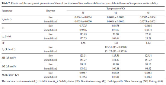Decayed relative activity was evidenced during incubation time at all studied temperatures (Figure 3). Such decay of relative activity increases as temperature rises, thus indicating that temperatures of over 45 °C accelerate enzyme inactivation, destroying the lipase structure, leading to a decrease in enzymatic activity. This increase in thermal stability can also be explained by the increase in surface hydrophobic interactions between the lipase-carrier and the reduction of lipase conformational changes compared with free lipase. The presence of secondary interactions (hydrogen bonds, polar and ionic interactions) between the enzyme and the transporter is also an important factor in increasing thermal stability.41 In general, the immobilized enzyme shows a greater temperature tolerance, which is related to the increase in the rigidity of the secondary structure of the immobilized lipase.42 At the end of 1 h, the relative activities of immobilized enzyme at 35, 41 and 45 °C were 15.07, 13.48 and 12.82% higher, respectively, if compared to the free lipase, therefore it is found that the immobilization process confers thermal stability to the enzyme. Nematian et al.43 also found similar results while the residual activities of R. oryzae lipase immobilized on magnetic nanoparticles (Fe3O4) and magnetic graphene oxide after 60 min incubation and at 60 °C were 13.09 and 27.20%, respectively. Kinetic and thermodynamic parameters of thermal inactivation Estimating kinetic and thermodynamic parameters is extremely important in enzymatic processes, as it assists in understanding how enzyme denaturation might behave. Kinetic and thermodynamic parameters of thermal inactivation of both the free and immobilized enzyme were determined according to the influence of temperature on their stability. These parameters are described in Table 7.