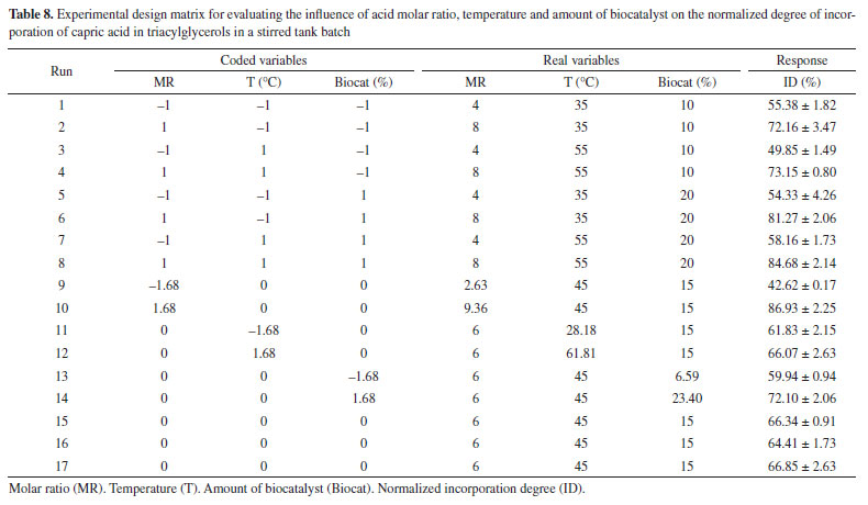 In general, results show that higher temperatures accelerate the thermal deactivation of the enzyme in its free or immobilized form, since there was an increase in thermal deactivation constant (kd). In addition, compared to the free enzyme, there was a decrease in kd values for immobilized forms, which demonstrates that the immobilization process conferred more thermal stability to the enzyme. Half-life time (t1/2) corresponds to the time required to halve the initial enzyme activity.28 The immobilization process makes lipase more stable, and higher values of half-life times are found as a consequence. This behavior was also demonstrated by the stability factor (SF), wherein the immobilized enzyme showed 1.56, 1.48 and 1.12 times more stability in comparison with its free form at temperatures of 35, 41 and 45 °C, respectively. Faria et al.23 also reported stability factor values in the range of 1.4 to 2.5 for immobilized FTase enzyme. An increase in deactivation energy (Ed) for the immobilized enzyme (151.27 kJ mol-1) indicates that it requires more energy to initiate the thermal inactivation process when compared to the free lipase (125.51 kJ mol-1), thus evidencing enzyme thermostability improvement. Ed represents the energy barrier to be overcome for enzyme inactivation, therefore, the higher it is, the more energy is required and better stability is conferred.44 Enthalpy (∆H), i.e., heat exchange, provides the number of non-covalent bonds broken, and represents a measure of the energy barrier to be overcome for molecules to start reacting.45 Thus, it was evidenced that the immobilized enzyme, which presented higher values of ∆H needs more energy for stretching, compressing, or breaking bonds to undergo a change from a native to a denatured state. Entropy (∆S) measures the disorder of the enzyme structure and it is associated with the transition state formation. Positive values of ∆S indicate that system disorder increases as the enzyme denatures.44 According to Rigo et al.46 values of ∆S close to zero indicate that thermal inactivation caused no relevant change in the tertiary structure of the enzyme, i.e., most hydrogen bonds responsible for the active structure of the catalytic site of the enzyme are still present in the activated complex. The authors also reports low ∆S values (around 0.097 and 0.149 for free and immobilized enzymes, respectively) and that there was no clear variation in temperature. In terms of enzyme stability, there is a relationship between the values of ∆H and ∆S , in which high ∆H and low ∆S values reveal an increase in enzyme stability.47 Gibbs free energy (∆G) expresses the spontaneity of enzyme's loss of stability, as lower values reveal greater tendency to denaturation. Higher Gibbs free energy values for immobilized lipase indicate that immobilization conferred greater stability to the enzyme. Positive values of ∆G showed that the process of enzyme thermal inactivation is thermodynamically non-spontaneous.47 Results found for ∆G in this study agreed with the values of ∆G (98.6-104.9 kJ mol-1, from 40 to 70 °C) reported by Ortega et al.47 A decrease in ∆G at temperatures from 41 to 45 °C may be related to decreased availability of reactive sites by denaturation and a change in its initial conformation.48 Therefore, according to these results, lipase immobilization conferred thermal stability to the enzyme, such as an increase in its half-life time. Stirred tank batch reactions In order to optimize reaction conditions for triglycerides synthesis, the influence of reaction parameters, such as acid molar ratio (MR) (acid-to-oil), temperature, T (°C), and amount of biocatalyst, Biocat (m m-1), (mass of biocatalyst to mass of oil, in %) on the normalized incorporation degree, ID (%), was evaluated through a CCDR experimental design. Table 8 presents the experimental design matrix.