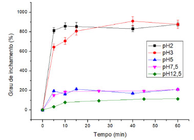 ![]() Figura 2. Grau de inchamento dos filmes de quitosana em diferentes níveis de pH (filmes de 1,0 cm2, tampão Britton-Robinson 0,200 mol L-1, 90 rpm)