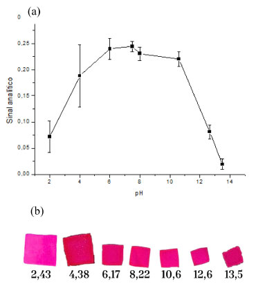 ![]() Figura 4. (a) Influência do pH sobre o sinal analítico. (b) Imagens digitais obtidas para os filmes de quitosana contendo Bordeaux S em diferentes níveis de pH (Bordeaux S 2,00 mg L-1, filmes de 1,0 cm2, tampão Britton-Robinson 0,200 mol L-1, 90 rpm, 60 min)