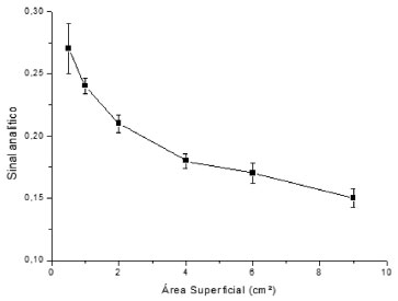 ![]() Figura 5. Influência da área superficial do filme de quitosana sobre o sinal analítico (Bordeaux S 2,00 mg L-1, tampão citrato/fosfato de sódio 0,200 mol L-1 pH 7,5, 90 rpm, 60 min)