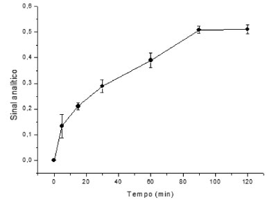 ![]() Figura 6. Influência do tempo de agitação (Bordeaux S 2,00 mg L-1, tampão citrato/fosfato de sódio 0,200 mol L-1 pH 7,5, filmes de 1,0 cm2, 90 rpm)