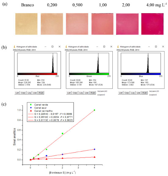 Figura 7. (a) Exemplos de imagens digitais geradas para a construção de curvas analíticas. (b) Exemplos dos histogramas gerados pelo software em cada canal de cor. (c) Exemplos de curvas analíticas geradas em cada canal (Bordeaux S 0,200-4,00 mg L-1, tampão citrato/fosfato de sódio 0,200 mol L-1 pH 7,5, filmes de 1,0 cm2, 90 rpm, 90 min)