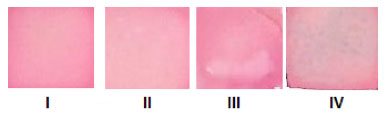 ![]() Figura 8. Imagens digitais do corante presente em cada amostra de gelatina (I-IV, de acordo com a Tabela 6) sorvido em filmes de quitosana (tampão citrato/fosfato de sódio 0,200 mol L-1 pH 7,5, filmes de 1,0 cm2, 90 rpm, 90 min)