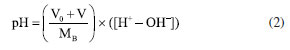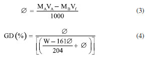 PARTE EXPERIMENTAL Reagentes e instrumentação Todos os reagentes utilizados foram de grau analítico, não sendo realizadas maiores purificações. As soluções necessárias foram preparadas com água ultrapura (18 MΩ cm de resistividade) obtida através de um sistema purificador Arium Pró Sartorius (Alemanha). Soluções estoque 200,0 mg L-1 do corante Bordeaux S (Roha, Índia) foram preparadas a partir da solubilização do sólido, e diluídas em meio aquoso a padrões analíticos de 0,200-4,00 mg L-1, os quais eram preparados diariamente. Tampões citrato/fosfato de sódio 0,200 mol L-1 e Britton-Robinson25 0,200 mol L-1 foram preparados pela solubilização e diluição dos reagentes (Sigma-Aldrich, Alemanha). Os materiais foram pesados em balança analítica (Sartorius, Alemanha). Um scanner HP DeskJet GT 5822 (EUA) foi empregado para obter as imagens digitais em 300 dpi, 24 bits e formato .tiff, em tamanho de 2550 × 3507 pixels. O software ImageJ34 (National Institutes of Health, EUA) foi utilizado para o processamento dos dados. Uma mesa agitadora KASVI K45 (Hong Kong) foi também empregada, e medidas de pH tomadas com pHmetro (Sensorglass, Brasil). O alongamento dos filmes de quitosana foi determinado com um paquímetro digital (Mitutoyo, Japão), com resolução de 0,010 ± 0,005 mm. Procedimento geral Padrões analíticos do corante foram preparados em balões volumétricos de 50,00 mL, por adição de incrementos crescentes da solução estoque e tamponados com tampão citrato/fosfato de sódio 0,200 mol L-1 em pH 7,5. Em seguida, 10,0 mL de cada solução foi transferida para tubos de polipropileno de 15,0 mL. Filmes de quitosana de 1,0 cm2 foram adicionados a cada tubo, os quais foram colocados sobre mesa agitadora por 90 min a 90 rpm. Brancos analíticos foram preparados da mesma forma, porém sem conterem o analito. Por fim, os filmes foram separados das soluções, secos em dessecador por cerca de 15 min e tiveram suas imagens obtidas com auxílio do scanner, a fim de ser determinada a relação entre coloração do filme e concentração das soluções. Preparo das amostras Alíquotas de 1,0 g de amostras de gelatinas foram transferidas para béqueres e dissolvidas em 80,0 mL de água ultrapura a 65 ºC até total solubilização. Em seguida as soluções foram resfriadas à temperatura ambiente (25 ºC) e quantitativamente transferidas a balões volumétricos de 100,00 mL, cujos volumes foram completados com água ultrapura. 500 µL de amostras assim diluídas de gelatinas comuns foram transferidas para tubos de polipropileno e tamponadas com citrato/fosfato de sódio 0,200 mol L-1 em pH 7,5 até volume final de 10,0 mL. Amostras de gelatinas diet e zero, por apresentarem maior conteúdo do corante, foram preparadas de modo análogo, porém empregando-se 200 µL das soluções diluídas. Obtenção do sinal analítico As imagens obtidas dos filmes de quitosana em que o analito se encontrava retido foram analisadas empregando-se o software ImageJ34 e os sinais analíticos (S) foram dados conforme a Equação 1, em que P0 corresponde à intensidade de cor obtida para os brancos analíticos e P aos padrões ou amostras. Já que o corante Bordeaux S adsorvido nos filmes de quitosana apresentam coloração rosa-avermelhada, o canal verde foi selecionado, por ser a coloração complementar à visualizada e assim fornecer maior sensibilidade analítica. ![]() Preparo dos filmes de quitosana Os filmes poliméricos foram produzidos empregando-se o método de fundição por solvente,33 dissolvendo-se 3,33 g de quitosana em pó (Sigma Aldrich, Alemanha) em 1,0 L de solução aquosa de ácido acético 2,0% v v-1 a temperatura ambiente (25 ºC), sob agitação magnética durante período de 6 h. A mistura resultante foi filtrada a vácuo e 150 mL do filtrado foram depositados sobre placas de petri de 15 cm de diâmetro, as quais foram aquecidas a 65 ºC por 48 h, a fim de eliminar o ácido acético residual. Por fim, os filmes foram removidos das placas, cortados em porções de 1 cm2 com auxílio de um bisturi e armazenados em dessecadores a 25 ºC. Caracterização dos filmes de quitosana Espectroscopia de infravermelho com transformada de Fourier (FT-IR) Os estudos de infravermelho com os filmes de quitosana puros e após adsorverem o corante foram realizados com um espectrômetro Agilent Cary FT-IR 660 com atenuância total de transmitância (ATR) de 400 a 4000 cm-1, empregando-se reflectância difusa e pastilhas de KBr. Microscopia eletrônica de varredura (SEM) A morfologia dos filmes de quitosana puros foi determinada com auxílio de equipamento Thermo Scientific SEM Quanta Feg 250 de 5 a 10 kV e faixa de magnificação de 100 a 1600 vezes, tendo sido necessário depósito de filme fino de ouro na superfície da amostra para torná-la condutora. Grau de desacetilação O grau de desacetilação da quitosana foi determinado por método de titulação potenciométrica,35-37 dissolvendo-se 0,25 g de quitosana em 20,0 mL de solução padronizada de HCl 0,10 mol L-1, transferindo-se a mistura para balão volumétrico de 100,00 mL e completando-se o volume deste com água ultrapura. O pH das soluções assim preparadas foi ajustado a aproximadamente 2,0 com solução padronizada de NaOH 0,10 mol L-1, condição tomada como o ponto inicial da titulação, a qual prosseguiu ate atingir-se pH próximo de 11,0. A curva de titulação foi gerada tomando-se o pH em função do volume de NaOH adicionado, dada pela Equação 2. ![]() Em que V (mL) é o volume de NaOH gasto na titulação, V0 (mL) é o volume da solução de quitosana analisada, e MB a concentração molar da solução de NaOH. O ponto final foi calculado segundo a Equação 3, e este foi empregado na Equação 4 para determinar o grau desacetilação (∅). ![]() Em que MA (mol L-1) e VA (mL) são, respectivamente, concentração e volume da solução de HCl adicionada, MB (mol L-1) a concentração da solução pad