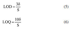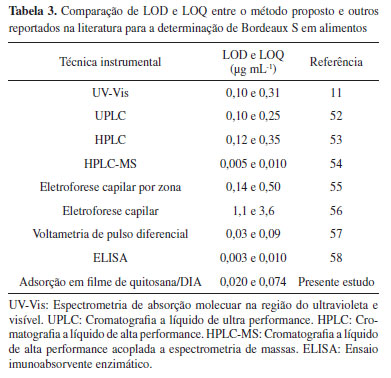 Os limites de detecção (LOD) e quantificação (LOQ) foram calculados conforme as Equações 5 e 6, respectivamente, em que δ é o desvio padrão entre sinais obtidos para os pontos de menor concentração de analito das curvas analíticas, e S é o coeficiente angular médio.51 Assim, LOD e LOQ foram equivalentes, respectivamente, a 0,020 mg L-1 e 0,074 mg L-1. ![]() A Tabela 3 apresenta comparação entre LOD e LOQ calculados para o método proposto e demais métodos presentes na literatura, para determinação de Bordeaux S em amostras de alimentos. É possível notar que o método aqui apresentado exibe limites melhores que muitos dos já desenvolvidos.