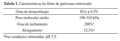 O alongamento do filme de quitosana em função da variação de pH, que resulta no aumento de sua área superficial, é mostrado na Figura 3. A Tabela 1 informa acerca das características gerais do filme. Tais resultados corroboram a ocorrência da expansão das cadeias poliméricas do filme pela protonação da estrutura.41,42