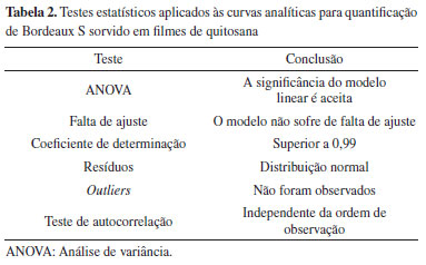 Significância da relação linear e limites de detecção e quantificação Estudos de análise de variância (ANOVA) aplicados para avaliação da linearidade das curvas analíticas geradas pelo método proposto indicaram adequabilidade do modelo linear ao intervalo de concentrações de analito empregado. O modelo de regressão ajustado por mínimos quadrados foi significante para o método proposto e não sofreu falta de ajuste, explicando 99,68% da variabilidade dos dados. O coeficiente de determinação obtido indica elevada correlação entre as variáveis sinal analítico e concentração de corante. Considerando-se os resíduos, os testes Shapiro-Wilk e Cochran mostraram distribuição normal, não tendenciosa, dos dados. Adicionalmente, a aplicação do teste de Durbin-Watson aos dados indicou que nenhum erro sistemático é oriundo da ordem de análise.51 A Tabela 2 resume os resultados destes testes estatísticos aplicados às curvas analíticas.