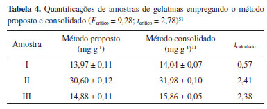 Exatidão e precisão A precisão do método foi avaliada em termos de repetitividade e reprodutibilidade.51 A repetitividade foi calculada como o desvio padrão relativo dos sinais analíticos obtidos em dez medidas de uma mesma imagem de filme de quitosana contendo a menor concentração de corante presente na curva analítica (0,500 mg L-1 ), estabelecida então como 2,1%. A reprodutibilidade, por sua vez, foi tomada como o desvio padrão relativo dos sinais analíticos obtidos para as medidas de dez imagens diferentes de filme contendo a mesma concentração de corante, equivalente a 4,1%. A exatidão do método proposto foi avaliada segundo duas diferentes abordagens: primeiramente em termos de testes de recuperação, fortificando-se soluções das amostras e, posteriormente, comparando-se estatisticamente os resultados obtidos nas quantificações com método consolidado de absorção molecular na região do UV-Vis.11 Os testes de recuperação foram conduzidos empregando-se amostras de gelatinas comuns. Alíquotas de 500 µL das soluções diluídas das amostras foram submetidas em triplicata ao método proposto. Em seguida, alíquotas em triplicata de mesmo volume e das mesmas amostras foram fortificadas com 0,500 mg L-1 de padrão analítico do corante. A recuperação média, dada pela média das razões percentuais entre as concentrações efetivamente obtidas para as amostras fortificadas e as esperadas, foi empregada como a exatidão do método,51 equivalente a 99,1%. A exatidão do método proposto foi também confirmada pela comparação dos resultados das quantificações de amostras de gelatinas comuns, com os resultados obtidos por método espectrofotométrico pré-estabelecido,11 como informa a Tabela 4. Todas as amostras foram avaliadas em triplicatas.