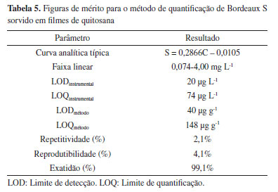 Após a aplicação do teste t-Student com equivalência estatística da precisão no nível de confiança de 95%, para efetuar a comparação entre estes resultados, verificou-se que não há diferença estatística entre os resultados apresentados por ambos os métodos. Essa equivalência estatística juntamente com os elevados percentuais de recuperação alcançados para as amostras, permitem concluir que o método apresenta exatidão satisfatória.51 Enfim, a Tabela 5 mostra um resumo dos parâmetros de mérito do método desenvolvido.