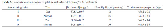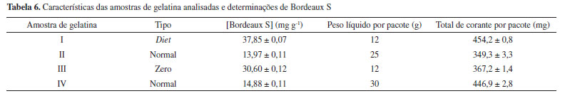 É importante notar que, considerando-se a massa total de corante por pacote de gelatina, e o peso de um indivíduo adulto como 70 kg, o total de corante para todas as amostras foi muito superior à máxima ingestão diária permitida segundo a ANVISA (0,50 mg kg-1 de massa corporal do indivíduo que o ingere).