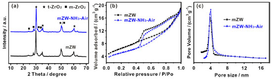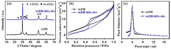 Figure 1. (a) XRD patterns; (b) N2 adsorption-desorption curve and (c) pore size distribution (calculated by BJH model) of mZW and mZW-NH3-air