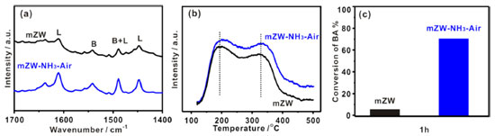 Figure 2. mZW and mZW-NH3-air catalyst. (a) Pyridine-IR spectra (150 ºC), (b) NH3-TPD spectra and (c) the conversion of BA (1 h) in the F-C reaction