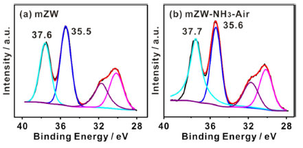 ![]() Figure 5. W4f XPS spectra of (a) mZW and (b) mZW-NH3-air