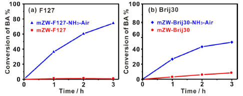 ![]() Figure 6. The BA conversion vs. reaction time in the F-C reaction using mZW-S as catalysts with different surfactant: (a) F127 and (b) brij30