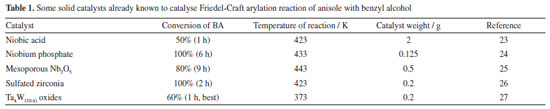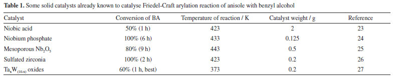 EXPERIMENTAL Catalysis preparation Mesoporous ZrO2-WO3 materials with a W/Zr molar ratio of 1:9 (denoted as mZW) were prepared by sol-gel method with Zr(BuO)4 (TBOZ) and WCl6 as precursors.20,21 Mesoporous ZrO2-WO3 materials with different surfactant (denoted as mZW-S) were synthesized by the similar method, except for the adding of pluronic (F127) or polyoxyl lauryl ether (brij 30) as structure directing agents. NH3-Air calcined ZrO2-WO3 (mZW-NH3-air) was prepared by calcining mZW in ammonia gas and subsequently in air. Specifically, 1.0 g mZW powder was thermally treated in a quartz tube with a stream of pure ammonia (40 mL min-1) going through the tube at 600 ºC (a ramp rate of 1 ºC min-1) for 24 h. The samples were then cooled down to room temperature under N2 flow (40 mL min-1). The nitrided ZrO2-WO3 was designated as mZW-NH3. The mZW-NH3 powder was placed in a crucible and heated in a furnace. The temperature was increased at a ramp rate of 5 ºC min-1 to 550 ºC under static air and maintained for 5 h to obtain mZW-NH3-air product. Characterization methods X-Ray diffraction analysis (XRD) data were recorded on an Ultima IV diffract meter using CuKa radiation with a step size of 0.02º and operated at 3 kW. Nitrogen adsorption-desorption isotherms were obtained using a Micromeritics ASAP 2020 at 77 K. The samples were pretreated under vacuum at 300 ºC for 3 h prior to N2 adsorption and desorption. The pore size distribution was obtained from desorption branch using the BJH model. X-Ray photoelectron spectroscopy (XPS) was carried out on a Thermo Scientific K-alpha spectrometer using Al-Ka X-ray source (1486.6 eV). The pressure inside the analysis was maintained at 5 × 10-7 mbar. The C 1s line at 284.8 eV was used for the correction of binding energies (BE). Transmission electron microscopy (TEM) imaging was performed in JEOL 2010 electron microscope operating at 200 kV. The samples were supported on carbon-coated copper grids. Ultraviolet-visible diffuse reflectance spectroscopy (UV-Vis-DRS) was recorded using a Shimadzu spectrometer with BaSO4 as background spectrum, with a scanning step of 0.5 nm. The acid properties of the samples were determined by Fourier-transform infrared spectroscopy (FT-IR), spectra of adsorbed pyridine (Py-IR) and temperature-programmed desorption of ammonia (NH3-TPD). FT-IR experiments were conducted on Tensor 27. The sample was treated at 450 ºC for 1 h under vacuum (1 Pa), cooled down to 150 ºC, and then exposed to pyridine vapors. The excess pyridine was removed by out gassing for 1 h. FT-IR spectra were obtained at room temperature after desorption at 150 ºC. NH3-TPD was recorded on an AutoChem1 II 2920 instrument with a thermal conductivity detector. About 0.10 g fresh sample was pretreated in air at 500 ºC for 1 h, followed by adsorption of NH3/air (10% v/v) at 100 ºC for 1 h, and purged under high purity helium. The NH3-TPD measurement was carried out from 100 to 500 ºC with heating rate of 10 ºC min-1. Acid-catalyzed reaction The F-C reaction of anisole and benzyl alcohol (BA for short) was carried out in a three-necked flask reactor. The reaction system was performed using 0.1 g catalyst, 5.445 mL anisole and 0.518 mL BA in an oil bath at 124 ºC for 1 h. The concentration of each substrate was analyzed by a gas chromatography (GC-2014, Shimadzu) equipped with a capillary column (SE-54 with dimensions of 30 m × 0.32 mm × 0.50 µm), using n-decane as an internal standard. The BA conversion and selectivity were calculated according to reference 21.