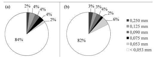 ![]() Figura 1. Frações granulométricas das partículas que constituem (a) a argila e (b) os resíduos de beneficiamento de rochas ornamentais, ambos utilizados como matéria-prima para fabricação dos corpos de prova cerâmicos