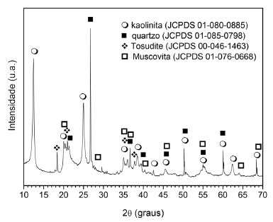 A Figura 2 mostra o difratograma da argila, restringindo a escala de 2q de 10 a 70º, que corresponde à região em que aparecem picos para indexação. Foram identificadas as fases cristalinas de silicatos e aluminosilicatos hidratados como kaolinita, tosudite, e muscovita, além do quartzo, que são característicos de argilas do tipo cauliníticas. Existe um insignificante halo entre 10 e 40º que pode indicar a possibilidade de material amorfo na argila.