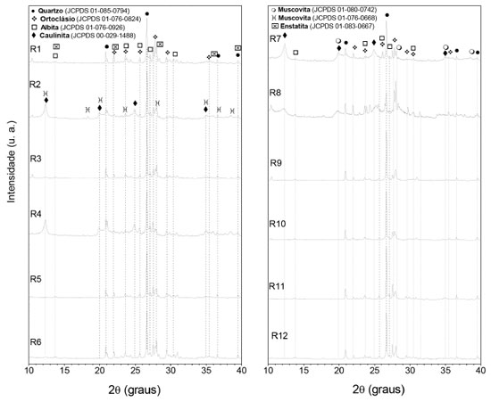 Figura 3. Difratogramas das amostras de resíduos finos do beneficiamento de rochas ornamentais utilizados como agregados na massa cerâmica testada nesse trabalho: quartzo SiO2 (JCPDS 01-085-0794); ortoclásio (K0.931Na0.055Ca0.009Ba0.005)(Al0.97Si3.03O8) (JCPDS 01-076-0824); albita (Na0.75Ca0.25)(Al1.26Si2.74O8) (JCPDS 01-076-0926); caulinita Al2Si2O5(OH)4(JCPDS 00-029-1488); muscovita K2(Al3.74Fe0.26)(Si6Al2O20)(OH)4 (JCPDS 01-076-0668); muscovita (K0.82Na0.18)(Fe0.03Al1.97)(AlSi3)O10(OH)2 (JCPDS 01-080-0742); enstatita Fe0.498Mg1.502O6Si2 (JCPDS 01-083-0667)