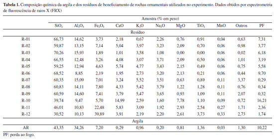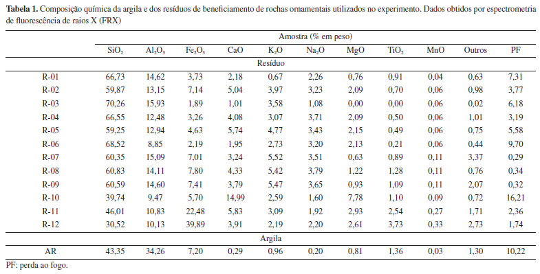PARTE EXPERIMENTAL Coleta de amostras As amostras de resíduos do beneficiamento de rochas ornamentais foram doadas por empresas do município de Cachoeiro de Itapemirim, ES, que se destaca na produção brasileira de rochas ornamentais. A amostragem foi realizada em locais diferentes, tanto dentro do parque de beneficiamento das empresas, quanto em aterros que armazenam resíduos, totalizando 12 amostras (R-01 a R-12). A amostra de argila foi doada por uma empresa do setor cerâmico no município de Campos dos Goytacazes, RJ, um importante produtor de cerâmica vermelha. Foi utilizado apenas um tipo de argila (AR), que constitui a matéria-prima convencional usada pela indústria cerâmica da região. Análise granulométrica As amostras de resíduo e de argila foram submetidas à análise granulométrica. Para isso, após secagem em estufa a 60 ºC, uma alíquota de 100 g de cada amostra foi tamisada em agitador elétrico com um conjunto de peneiras de aberturas: 0,250 mm (60 mesh); 0,125 mm (120 mesh); 0,088 mm (170 mesh); 0,074 mm (200 mesh) e 0,053 mm (270 mesh), além do caixilho para captar as partículas passantes na última peneira. Após o peneiramento de cada amostra, todo o conjunto de peneiras e caixilho foram lavados com água corrente e, após, com água destilada em lavadora ultrassônica. As frações foram pesadas e subtraídas do peso das peneiras para obter a porcentagem de cada fração nas amostras. Composição química e mineralógica dos resíduos e da argila A composição química dos resíduos e da argila foi obtida por meio da técnica de espectrometria de fluorescência de raios X (FRX) em um equipamento da marca Bruker, modelo S8 Tiger, com calibração automática. As amostras previamente secas foram moídas em moinho de bolas e misturadas com reagentes para confecção de pastilhas fundidas, na seguinte proporção: 1 g de amostra, 9 g de tetraborato de lítio e 1,5 g de carbonato de lítio. As misturas foram fundidas em uma máquina de fusão por 17 min sob temperatura de 1.300 ºC. A análise mineralógica das amostras foi feita por difratometria de raios X (DRX) utilizando um difratômetro da marca Rigaku, modelo MiniFlex 600-C, com tubo de cobre (CuKα, l = 1,5406 Å), operado a 40 kV e 20 mA. O ângulo 2θ inicial foi de 5º e o final de 70º, o passo empregado foi de 0,02º e a taxa de varredura igual a 10º (2θ) min-1. Preparação das peças cerâmicas para teste Os corpos de prova cerâmicos foram confeccionados na proporção de 80% de argila convencional e 20% de resíduo de rochas ornamentais. Também foram confeccionadas peças com 100% de argila pura para compor a amostra testemunha, em triplicata. Após a umidificação das misturas, feita com 10% (m/m), o material foi conformado utilizando uma prensa hidráulica da marca Teclago, modelo PCA 37. Em seguida, os corpos de prova foram submetidos à secagem em uma estufa da marca Fanem, model 520, por 24 h a 110 ºC. A sinterização foi realizada em um forno Fortelab, modelo ME 1700, sob 1.000 ºC por 1 h. A confecção de corpos de prova cerâmicos (fabricados com argila pura e com resíduo agregado) foi repetida para gerar dois lotes iguais: um deles foi preparado por moagem e o outro por trituração, para posterior realização do teste de solubilização. O primeiro lote foi preparado por meio de moagem em um moinho de panela revestida com carbeto de tungstênio da marca Contenco, modelo Pavitest, até obter granulação fina, passante em peneira de 9 mesh (2 mm). As amostras do segundo lote, de composição idêntica ao primeiro, foram trituradas em almofariz de ágata manualmente, utilizando-se um pistilo também de ágata, e os fragmentos resultantes foram passados pela peneira de 9 mesh (2 mm). Teste de solubilização O teste de solubilização foi realizado seguindo a NBR 10006/04.24 Nesse procedimento, uma alíquota de 250 g (base seca) de cada amostra previamente preparada (nesse trabalho: uma alíquota por moagem e outra por trituração) foi colocada em frasco de 1.500 mL, onde foram adicionados 1.000 mL de água ultrapura padrão Milli-Q; a mistura foi agitada em baixa velocidade, por 5 min. O frasco foi vedado com filme de PVC, foi tampado e deixado em repouso por 7 dias, a temperatura controlada de até 25 ºC. A solução sobrenadante foi filtrada em aparelho de filtração com membrana filtrante de porosidade 0,45 µm. O líquido obtido após a filtração é o extrato solubilizado. Uma alíquota do extrato solubilizado foi armazenada em frasco de polietileno previamente limpo e acidificada com ácido nítrico (HNO3) até atingir pH inferior a 2. Para cada rodada de ensaios, foram preparados brancos analíticos compostos por água ultrapura padrão Milli-Q, que passaram por todos os procedimentos aplicados às amostras estudadas. Análise do extrato solubilizado A concentração de metais no extrato solubilizado das cerâmicas CAM, CAT, CRM e CRT foi analisada por espectrometria de emissão óptica por plasma indutivamente acoplado (ICP OES) em um instrumento da marca Thermo Scientific, modelo ICAP6300 Duo, com potência de radiofrequência de 1.150 W, câmara de nebulização ciclônica, fluxo de gás de 0,50 L min-1, realizando-se 3 repetições de leitura para cada elemento. Os dados foram utilizados para caracterizar as amostras como inertes ou não-inertes, conforme a NBR 10004/04.22 Foram analisadas as concentrações de Al, Ag, As, Ba, Cd, Cr, Cu, Fe, Mn, Pb, Se e Zn. As concentrações dos elementos nos brancos analíticos ficaram sempre abaixo do limite de detecção do equipamento ou em níveis aceitáveis dentro da proposta desse trabalho e dos resultados obtidos.