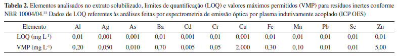 Alcione Alves de FreitasI,* I. Departamento de Engenharia Rural, Centro de Ciências Agrárias e Engenharias, Universidade Federal do Espírito Santo, 29500-000 Alegre - ES, Brasil Recebido: 18/06/2023 *e-mail: alcionedfreitas@gmail.com In order to clarify questions about the granulometric preparation of samples for the classification of solid wastes according to the Brazilian technical standard (NBR 10004/04), solubilization tests were carried out on red ceramic specimens made with conventional clay aggregated with ornamental rock residues. Samples were prepared by fragmentation and milling to verify the effects on metals releasing to the extractor medium. The specimens were made with 80% clay, 20% residue and 10% (m/m) moisture and sintered at 1000 ºC. The data show that ceramics made with conventional clay, when discarded, will produce non inert wastes, as well as the ceramics made with dimension stone wastes added to the conventional raw material, according to the granulometry of its particles. After all, the metals concentration in the solubilization test are influenced by the sample granulometry. This paper shows that the method of granulometric adjustment should be detailed in the technical standard for solubilization tests (NBR 10006/04), in order to ensure the reliability of the method for classification of solid wastes. INTRODUÇÃO O Brasil tem destaque mundial na produção de rochas ornamentais, com exportações que totalizaram cerca de US$ 1,3 milhões e 2,1 milhões de toneladas no ano de 2022.1 Embora tenha ocorrido pequeno recuo do volume físico exportado com relação ao ano anterior, elevaram-se as vendas de rochas mais caras. Variações positivas de valor foram registradas na comercialização de mármores, quartzitos e rochas silicáticas exóticas, direcionadas a consumidores de alto padrão aquisitivo.1 As exportações desses materiais são feitas sob a forma de blocos rochosos brutos ou de chapas acabadas, obtidas após o processo de beneficiamento. O beneficiamento é feito por meio de teares convencionais, que utilizam granalha de aço e cal para compor uma lama abrasiva, ou por teares de fios diamantados ou multifios.2,3 O processo convencional gera resíduos constituídos por um pó ultrafino composto, em grande parte, pela própria rocha cominuída, além dos insumos que compõem a lama; enquanto no caso dos teares multifios, o resíduo é composto basicamente por pó de rocha e água.4 O descarte dos resíduos da lama deve ser feito em aterros industriais,5 pois, quando lançados de forma inadequada no ambiente podem causar danos ambientais.6 Neste sentido, com a crescente preocupação em preservação ambiental e a busca pela economia verde, cada vez mais pesquisadores e produtores industriais têm buscado formas alternativas de destinação dos resíduos. O uso de resíduos industriais como parte da matéria-prima para a fabricação de vários produtos é considerado uma importante ferramenta na gestão de resíduos sólidos, pois além de minimizar os volumes descartados no ambiente, pode gerar emprego e renda. Vários trabalhos publicados já testaram, com resultados positivos, o uso de resíduos de rochas ornamentais na fabricação de diversos produtos,7 como materiais cerâmicos,2,8-15 cimento, concreto e argamassa,16-18 na remineralização e correção de pH do solo,19-21 dentre outros. Mas ainda existem preocupações relativas ao descarte de materiais agregados com resíduos industriais, uma vez que, conforme sua classificação, eles podem liberar elementos e compostos químicos potencialmente tóxicos à saúde humana, à fauna e à flora. De fato, a incorporação de resíduos industriais em produtos de qualquer natureza precisa ser feita de forma segura, passando, necessariamente, pelo conhecimento da composição dos materiais para conhecer seu potencial de impactos ambientais. O sistema de classificação de resíduos proposto pela Associação Brasileira de Normas Técnicas (ABNT) é comumente adotado por órgãos ambientais como normativa válida para avaliação do potencial de impactos ambientais de resíduos sólidos. De acordo com a NBR 10004/04,22 os resíduos podem ser classificados como perigosos (classe I) e não perigosos (classe II). Um resíduo é considerado perigoso se possuir propriedades físicas, químicas ou infectocontagiosas, com potencial risco à saúde pública e/ou ao meio ambiente, quando gerenciado de forma inadequada. Para verificação da periculosidade de um resíduo, realiza-se o teste de lixiviação,23 no qual a amostra é colocada em contato com solução ácida em um agitador rotatório de frascos e depois é filtrada, gerando um extrato lixiviado. Esse extrato é, então, analisado para verificar a concentração de elementos químicos ou substâncias químicas que passaram para a fase líquida, a qual é comparada com os limites normatizados estabelecidos pela agência reguladora por meio da NBR 10004/04.22 Os resíduos não-perigosos podem ser não-inertes (classe II-A) ou inertes (classe II-B). Os resíduos classe II-A podem ter propriedades como: biodegradabilidade, combustibilidade ou solubilidade em água, enquanto os resíduos classe II-B são aqueles que, quando submetidos ao contato dinâmico e estático com água destilada ou deionizada, em temperatura ambiente, não apresentam nenhum de seus constituintes solubilizados a concentrações superiores aos padrões de potabilidade de água, excetuando-se aspecto, cor, turbidez, dureza e sabor. A verificação do enquadramento dos resíduos na classe II-A (não inertes) ou II-B (inertes) é feita por meio do teste de solubilização.24 Para realização deste teste, a normativa determina que a amostra passe pela peneira de malha 9,5 mm; caso contrário, deve ser triturada. Contudo, a norma NBR 10006/04,24 que trata dos procedimentos para a preparação das amostras, não menciona a metodologia para o processo de trituração e possíveis contam