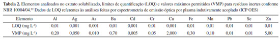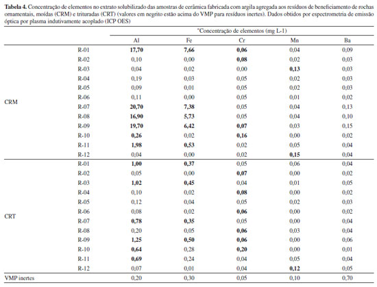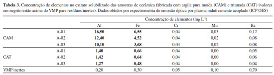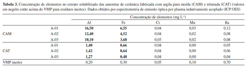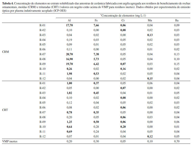 Foram medidas as concentrações de Al, Ag, As, Ba, Cd, Cr, Cu, Fe, Mn, Na, Pb, Se e Zn nos extratos solubilizados dos corpos cerâmicos feitos com argila pura, moídos (CAM) e triturados (CAT), e de argila com 20% de resíduos de rochas ornamentais, moídos (CRM) e triturados (CRT). Os elementos Ag, As, Cd, Cu, Na, Pb, Se e Zn ficaram abaixo do LOQ (Tabela 2) em todas as amostras analisadas. Dentre os elementos que aparecem em concentrações mensuráveis no extrato solubilizado, Al, Fe, Cr, Mn e Ba (Tabelas 3 e 4) constam na normativa da ABNT, a NBR 10004/0424 com valores máximos permitidos (VMPs) para que um resíduo seja considerado inerte.