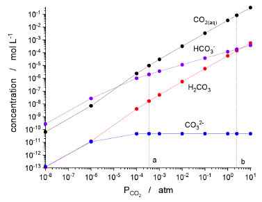 ![]() Figure 1. Concentration profiles of the carbon-containing species in the aqueous phase of a CO2/H2O system as a function of the CO2 partial pressure. Equilibrium constants: K2 = 2.13 × 1010 L mol-1,17 K3 = 4.0 × 103 L mol-1,15K4 = 588,15 and K5 = 30 atm L mol-1.18 The same plot is obtained if reaction 4 is replaced by 6 (K6 = 2.24 × 106 L mol-1).15 Dashed line a emphasizes the regular atmospheric condition, and line b emphasizes the threshold pressure above which H2CO3 is more abundant than HCO3-