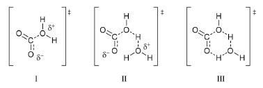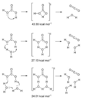 ![]() Figure 2. Decomposition of pure H2CO3 and in presence of one and two water molecules. The energy barriers are shown beneath the transition states (source: adapted from Loerting et al.)40