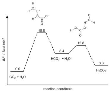 THEORETICAL CALCULATIONS By now, it should be clear that elucidating the mechanism of CO2 hydration is not straightforward. In addition to the set of experimental strategies used for elucidation, theoretical calculations and computational simulations have emerged as a complementary tool. The stability of solid H2CO3 is one of the questions that have been addressed. The synthesis and study of solid H2CO3 had revealed its surprising stability as a solid when compared to its fast decomposition in aqueous solution. This topic was addressed by Loerting et al.40 They calculated the energies of the transition states for the decomposition of H2CO3 in the presence of a growing number (n) of water molecules according to the schemes shown in Figure 2.