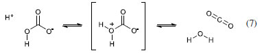 THE CARBONIC ANHYDRASE Another term coined for CO2 in the 19th century was “carbonic anhydride”, which follows directly from the assumption that CO2 would be the dehydration product of H2CO3. For instance, in 1860, Miller23 suggested that, in the absence of a definite “hydrate of carbonic acid” (H2CO3), “carbonic acid gas” (CO2) should be called “carbonic anhydride”. In 1933, when finally the enzyme that catalyzes the reaction between CO2 and H2O was isolated from ox blood and characterized, Meldrum and Roughton24 heeded their colleague Phillip Eggleton's suggestion and called it “carbonic anhydrase”.25 The term not only alludes to the dehydration of H2CO3, but this acid was then used to explain how the enzyme works (reactions 3 and 4). That enzyme – actually a member of a whole class of enzymes that catalyze the same reaction – was studied over the next decades, and by the end of the century, the mechanism of action of carbonic anhydrases was already elucidated.26 The catalysis mechanism uses to be represented as a set of 4 to 6 steps involving the central zinc atom, but it can also be depicted, in its most simplified form, by two elementary steps:27 ![]() It is noteworthy that at no time – even in the detailed version of the mechanism – it is proposed that H2CO3 is formed as a free molecule or a complex with the enzyme. Therefore, carbonic anhydrase actually catalyzes reaction 6 instead 4. Of course, without the enzyme, the path through reaction 4 could be indeed the correct one. However, despite the suggestive name of the enzyme, there is no support for reaction 4 here.