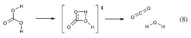 The first transition state would be the precursor of the zwitterion proposed by Eigen et al.19 The second one would be similar to the first, but allowing the formation of HCO3– and H3O+ without necessarily generating a zwitterionic species. The last transition state would be one formed in the concerted rearrangement leading to H2CO3 instead HCO3–. Their results for the deuterium isotope effect for hydration and dehydration reactions suggest that the first two transition states are more likely. Recent studies about kinetic isotope effects taking into account not hydrogen, but the natural isotopes of carbon and oxygen are not conclusive.20 A fundamental problem with the approach used in these studies is that only the isotope ratios for the tangible species CO2 and HCO3– can be measured; H2CO3 remains elusive. In any way, the results are in agreement with the conclusion by Pocker and Bjorkquist.16 An investigation about the protonation reaction of HCO3– was carried out by Adamczyk et al.21 using a photoacid that is optically triggered to transfer a proton to HCO3– on an ultrafast time scale. The monitoring of IR bands allowed demonstrating that not only H2CO3 is formed in aqueous medium on a nanosecond time scale, but also that it acts like an ordinary carboxylic acid. In addition, the pKa was also obtained, and the value 3.45 ± 0.15 is similar to the value 3.36 obtained by Thiel and Strohecker (cited by Buytendyk et al.)22 and other obtained by different methods. Transient signals in the region around 2364 cm-1 were not detected, which suggest that CO2 is not formed by dehydration of H2CO3 in the nanosecond time scale, i.e., the acid has a lifetime extending beyond 1 ns. It is important to note that this result does not contradict the models studied here, as reaction 3 is considered in both. The authors also stated that as the vibrational marker is located at a frequency typical for carbonyl stretching, the zwitterionic structure suggested by Eigen et al.19 can be excluded. This conclusion, however, does not consider the possibility that the zwitterion is not an intermediate, but a transition state. As an intermediate, it is reasonable to assume that its presence can be detected through spectroscopic methods. However, a transition state would not be detected. Moreover, the results are compatible with the second transition state shown in Scheme 1. Once again, the three models under investigation deny neither the protonation of HCO3– forming H2CO3, nor its reverse reaction. It is noteworthy that some studies consider a mechanism for the H2CO3 decomposition involving an intramolecular transition state: ![]() For instance, Terlouw et al.12 consider that the calculated activation energy higher than 40 kcal mol-1 for reaction 8 explains why H2CO3 is a stable species in the gas phase and supports the detection of it in their study about formation of H2CO3 in gas phase. However, the authors pointed out that the mechanism could, in fact, be different in solution.
