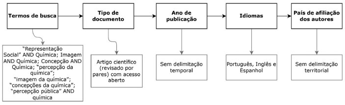 ![]() Figura 1. Filtros utilizados para a coleta dos dados (também foram buscados os termos em inglês e espanhol (fonte: elaborada pelas autoras no diagrams.net)