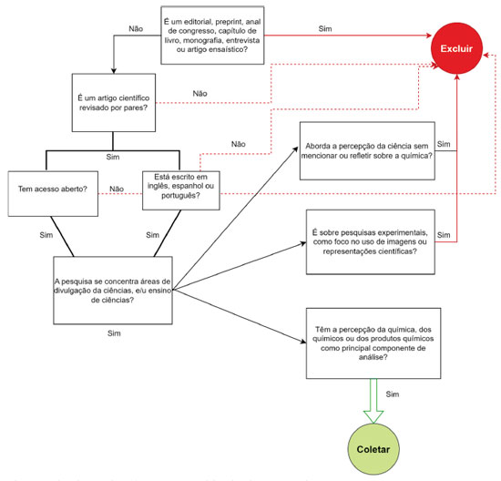 No total, obtivemos 99.755 resultados, sendo 98.031 do Google Acadêmico, 858 do Periódicos Capes, 239 da SciELO, 238 da Public Understanding of Science, 228 da Scopus, 77 da Química Nova, 64 da Journal of Science Communication, 10 da Química Nova na Escola, 10 da Journal of Science Education and Technology. A segunda etapa contou com uma análise dos resultados encontrados, visto que muitos deles não correspondiam ao objetivo da pesquisa. Para isso, seguimos um fluxograma com os critérios de inclusão e exclusão, conforme a Figura 2.