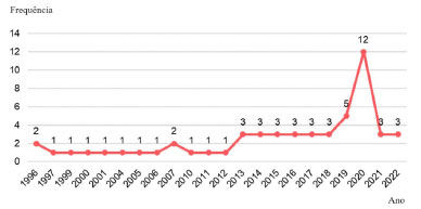 ![]() Figura 3. Distribuição dos 54 artigos ao longo do tempo