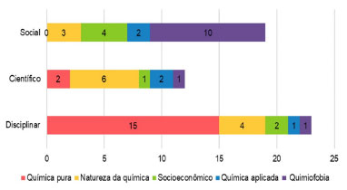 Ao cruzar os dados dos enfoques dos artigos, com as dimensões da química investigadas, buscamos melhor compreender o objeto de estudo das publicações em percepção da química. Observamos, por exemplo, que a maioria dos artigos categorizados como “Disciplinar” trazem aspectos formais, conteudistas da química, priorizando a dimensão “Química pura”. Portanto, ao investigar como os alunos percebem e compreendem a química, o que está em foco são os conhecimentos escolares, e não uma reflexão crítica da interação da química com a sociedade, questões éticas, percepção dos profissionais de química ou da prática e produção científica na área da química. Por outro lado, entre os artigos que retratam a química como parte da sociedade, destacando o seu papel no cotidiano, a dimensão mais abordada é a quimiofobia, ou seja, mais do que buscar entender como a sociedade percebe a química, os artigos buscam investigar o medo da química e de suas substâncias. Já os artigos que destacavam o lado científico da química, estavam mais preocupados em trabalhar os aspectos reflexivos sobre o fazer científico usado no desenvolvimento da química. Os dados podem ser observados na Figura 4.