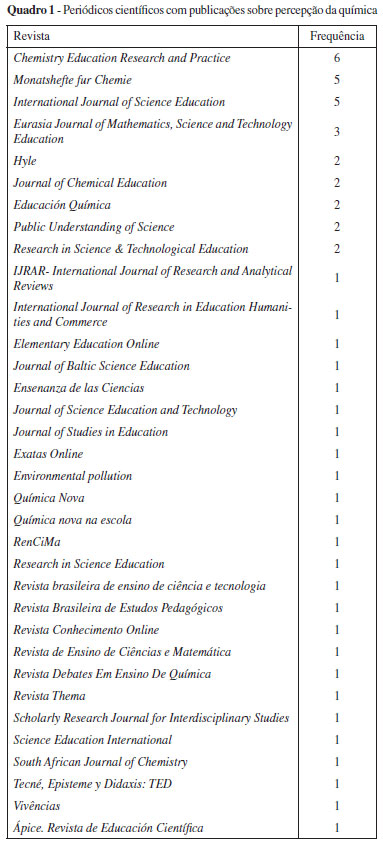 RESULTADOS No total, foram coletados 54 artigos oriundos de quatro bases de dados diferentes. Metade foi recuperado pela Scopus (27 artigos), seguido pelo Google Acadêmico (17 artigos), Periódicos Capes (8 artigos), e pelo site da Public Understanding of Science (2 artigos). As buscas realizadas na SciELO não recuperaram novos dados, pois os artigos encontrados já haviam sido previamente coletados. Dentre as principais revistas internacionais de divulgação científica – Journal of Science Education, JCOM, JCOM - AL, PUS, e CTS, apenas na PUS encontramos publicações sobre a percepção da química. Ao optar por coletar apenas artigos científicos deixamos de fora livros como The Public Image of Chemistry,1 uma coletânea de 12 pesquisas que investigam a percepção pública da química, seja nos filmes, museus ou outras iniciativas, sendo uma referência importante na área. Contudo, a obra não traz estudos nos moldes das pesquisas de percepção pública da ciência, com surveys e investigações sobre a representação social da química. Os 54 artigos que compõem nosso corpus foram publicados por 36 revistas diferentes, em geral ligadas ao ensino de química ou ensino de ciências. A revista com o maior número de publicações foi a Chemistry Education Research and Practice, com seis artigos sobre a percepção da química. Em seguida aparece a Monatshefte für Chemie, com cinco artigos publicados, e o International Journal of Science Education, com quatro publicações. A relação de revistas e publicações coletadas pode ser vista no Quadro 1.