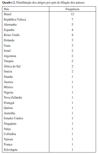 A grande maioria das revistas (28) publicou apenas um artigo sobre o tema, portanto esta não parece ser um interesse recorrente de pesquisa, contando com publicações dispersas. Por outro lado, acreditamos que pela característica interdisciplinar das pesquisas de percepção da ciência,17 que se dão no âmbito da divulgação científica, um campo emergente que vem se consolidando nas últimas décadas,14 nos parece coerente que a percepção da química também conte com publicações dispersas, especialmente pela temática também ser interesse de estudo de pesquisas voltadas ao ensino da química. As revistas Química Nova e Química Nova na Escola, apesar de serem publicações da SBQ voltadas para a publicação de artigos com resultados originais de pesquisa, trabalhos de revisão, educação, divulgação de novos métodos ou técnicas e assuntos gerais ligados a química, contam com apenas um artigo cada. Dado que indica uma lacuna de produção, o que nos leva a crer que estudos que envolvam a percepção, e representação social, da química entre a população brasileira não têm sido um interesse de pesquisa, visto a relevância dessas revistas para o campo da química no Brasil. Estudos que se dedicam a investigar a maturidade de um campo científico destacam que os autores são atores imprescindíveis, visto que são responsáveis pela publicação dos artigos científicos e desenvolvimento de determinado campo de conhecimento.18 Assim, observar as informações relativas à autoria pode ajudar a entender o grau de consolidação de determinada área ou campo científico. Em nosso estudo os artigos coletados foram escritos por 135 autores, com a maioria deles (109; 80,7%) publicando apenas um artigo cada. Visto que apareceram uma única vez, esses autores podem ser considerados transitórios,18 logo, eles podem ter um interesse pontual ou recente sobre o tema em questão. O baixo número de autores que publicam de maneira constante na área demonstra a falta de pesquisadores comprometidos com a percepção da química. Entre os autores permanentes, ou seja, aqueles que aparecem constantemente todos os anos18 os tchecos Karel Nesmerák e Radek Chalupa surgem como principal nome, tendo publicado conjuntamente ao menos um artigo por ano entre 2018 e 2022, num total de cinco artigos. Já as pesquisadoras da Alemanha Lilith Rüschenpöhler e Silvija Markic, apesar de terem colaborado na publicação de três artigos científicos, tiveram suas publicações concentradas no ano de 2020, sendo necessária uma investigação dos próximos anos para definir se elas vão se estabelecer como autoras permanentes do campo ou não. A temática parece ser trabalhada em conjunto, visto que a maioria das publicações foi escrita em colaboração (43), com 21 delas tendo dois autores, 12 com três autores, 7 com quatro autores. Os artigos com cinco, seis ou sete autores tiveram apenas uma publicação cada. Em relação a distribuição geográfica, os artigos se dividem entre 27 países, com destaque para o Brasil, com doze publicações, a República Tcheca, com sete, e a Alemanha, com cinco. Os demais podem ser observados no Quadro 2. De forma geral as publicações se distribuem por todo o globo, com estudos de todos os continentes, mas há um predomínio dos países europeus, que juntos somam mais da metade da amostra (32 artigos). Essa tendência também é observada no campo acadêmico da divulgação científica, em que o inglês é o idioma predominante e a produção científica é concentrada nos Estados Unidos e na Europa, particularmente no Reino Unido.15,19 Cabe lembrar que a única pesquisa de percepção pública da química foi realizada em um país europeu, justamente no Reino Unido.6 Então, muitas referências sobre a percepção da química discorrem sobre a perspectiva europeia, de países colonizadores e com uma tradição científica mais extensa do que outros países considerados ainda em desenvolvimento, como países da América Latina, África e Oriente Médio.
