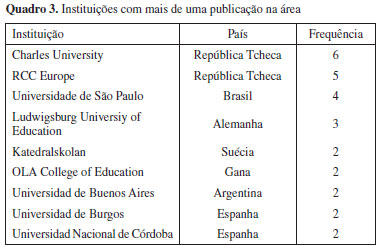 Como utilizamos descritores em português, inglês e espanhol, acreditamos que essa escolha pode ter levado a um maior número de artigos brasileiros, publicados em português, recuperados. Ao optar por esse recorte deixamos de fora publicações em outras línguas como tcheco e alemão, que tiveram que ser descartadas por falta de compreensão da língua. Os artigos se distribuem por 68 instituições, com a maioria delas (59) com apenas uma publicação na área, portanto foram identificados poucos grupos de pesquisa dedicados a entender as percepções e atitudes do público em relação a química. No Quadro 3, são mostradas as instituições que publicaram mais de um artigo na área. Entre os grupos que se dedicam a percepção da química os pesquisadores da Charles University, da República Tcheca se destacam, concentrando boa parte da publicação do país. Já a produção brasileira se divide entre 11 instituições, em que apenas a Universidade de São Paulo conta com mais de um artigo dentro do tema em questão, com um total de quatro publicações.