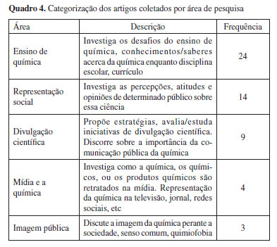 Os artigos mais antigos datam de 1996: “Perceptions of chemistry: Why is the common perception of chemistry, the most visual of sciences, so distorted?” publicado na Journal of Science Educationand Technology por Clarisse L. Habraken, autora da Holanda. E “Measurement of the confidence, attitudes, and self-image of Turkish student-teachers in relation to chemistry education” publicado na International Journal of Science Education por Eralp H. Altun e Satilmis Kaya, do Reino Unido e Turquia, respectivamente. A respeito da população estudada pelos artigos, mais da metade (35 artigos) investigou a percepção de estudantes, seja do ensino básico (27), do superior (7), ou pré-vestibular (01). A mídia foi objeto de estudo de cinco publicações, que avaliaram revistas, vídeos, tweets e jornais. Três artigos investigaram estratégias de comunicação pública da química, e outros três avaliaram os professores. Os demais artigos se debruçaram sobre o público geral, sem especificar, além de documentos, profissionais de química, exposições de museu de ciências, e grupos específicos como fumantes e ex-fumantes. A metodologia empregada se dividiu entre os que optaram por estudos quantitativos (20), qualitativos (19), e mistos (10), em cinco artigos não ficou claro qual foi a metodologia utilizada. Seguindo a tendência de outras pesquisas de percepção pública da ciência8,9,17 a maioria dos artigos (28) utilizaram os questionários como ferramenta para coleta dos dados. Outros 11 fizeram entrevistas, e 6 optaram pela pesquisa bibliográfica. A pesquisa documental, estudo de caso, desenho e observação participante foram empregadas por dois artigos cada. Enquanto a mineração de dados foi usada em uma publicação. Apenas parte dos artigos deixou claro que método foi usado para analisar os dados (29 artigos), dentre os mais citados temos a análise de conteúdo (13), e a análise estatística (11). A análise temática (dois), discursiva (dois), categorial (um), e de sentimentos (um), também foram mencionadas. Ao considerar revisões anteriores sobre o estado da arte das pesquisas em divulgação científica,14,21 agrupamos os artigos coletados em categorias segundo os temas estudados, de modo a entender o interesse central das pesquisas sobre percepção da química. Os artigos foram categorizados em sete áreas: Ensino de química, Representação social, Divulgação científica, Mídia e a química, e Imagem pública. Como podemos observar no Quadro 4, a maior parte dos artigos é voltado para o ensino de química, seus desafios e perspectivas. Portanto, a produção científica sobre percepção da química parece se centralizar no estudo das representações, atitudes e opiniões dos estudantes sobre a disciplina escolar química. Tendência contrária aos estudos de percepção da ciência, que tem como tradição as pesquisas do tipo survey para investigar as opiniões e atitudes de públicos diversos sobre ciência e tecnologia.5,8,17